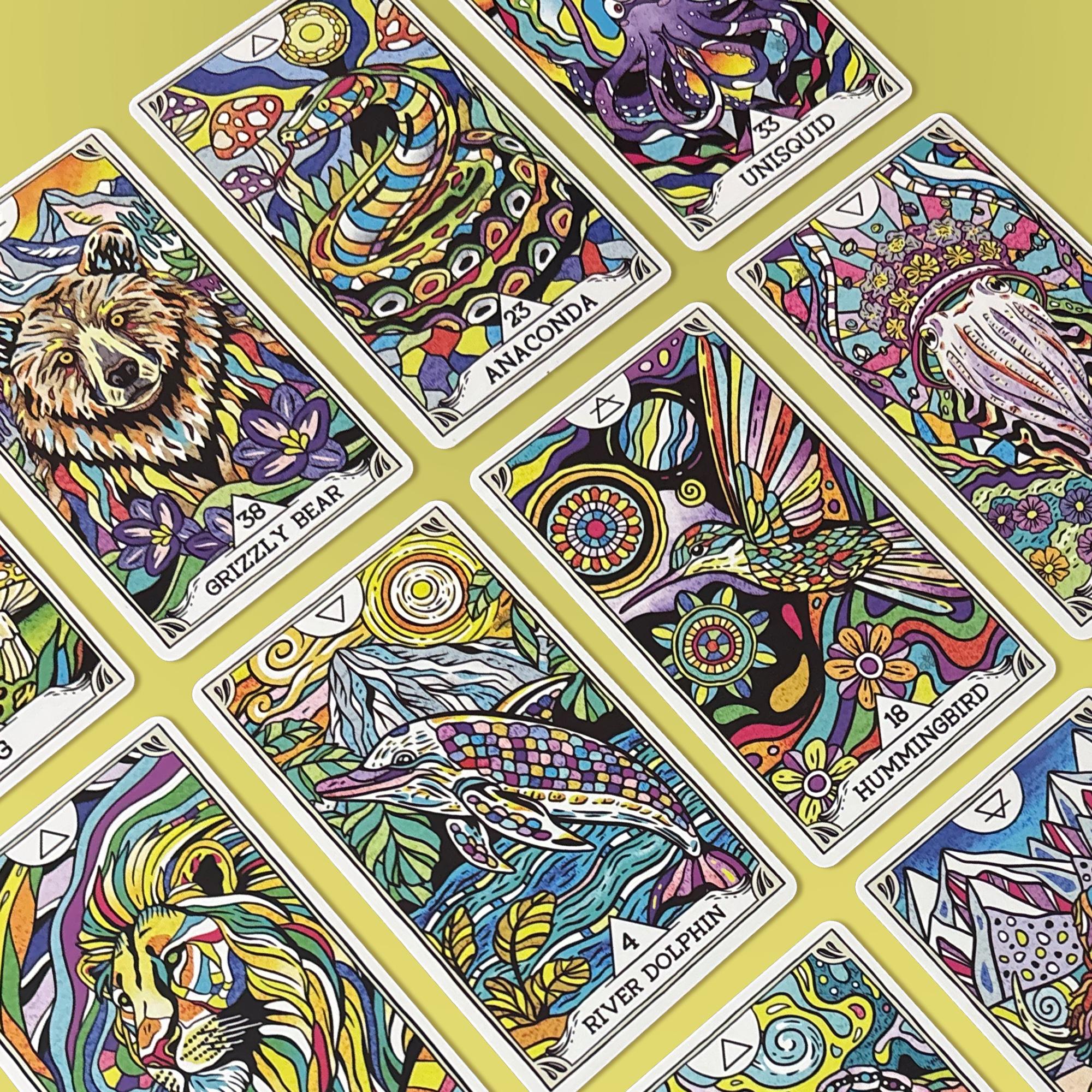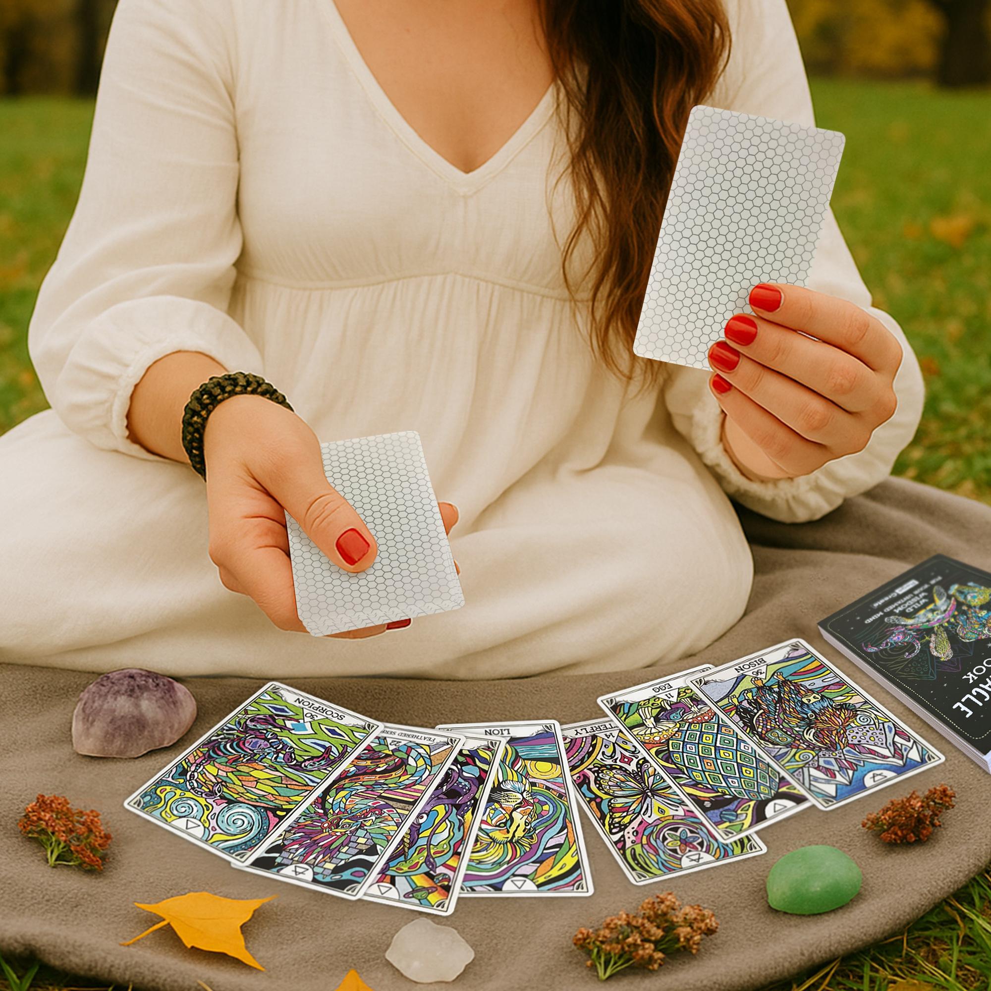 Each deck is wrapped in recycled kraft paper, never plastic. They are like little presents. Honor the Great Mother Earth from which we blossom.