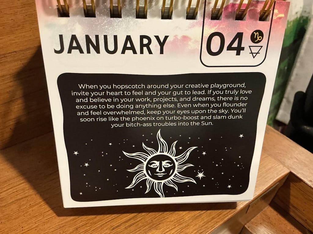 What a magical and inspiring desk calendar. It's perfect! I got one for me and a friend. Great size and so many cool graphics and inspiring pages!