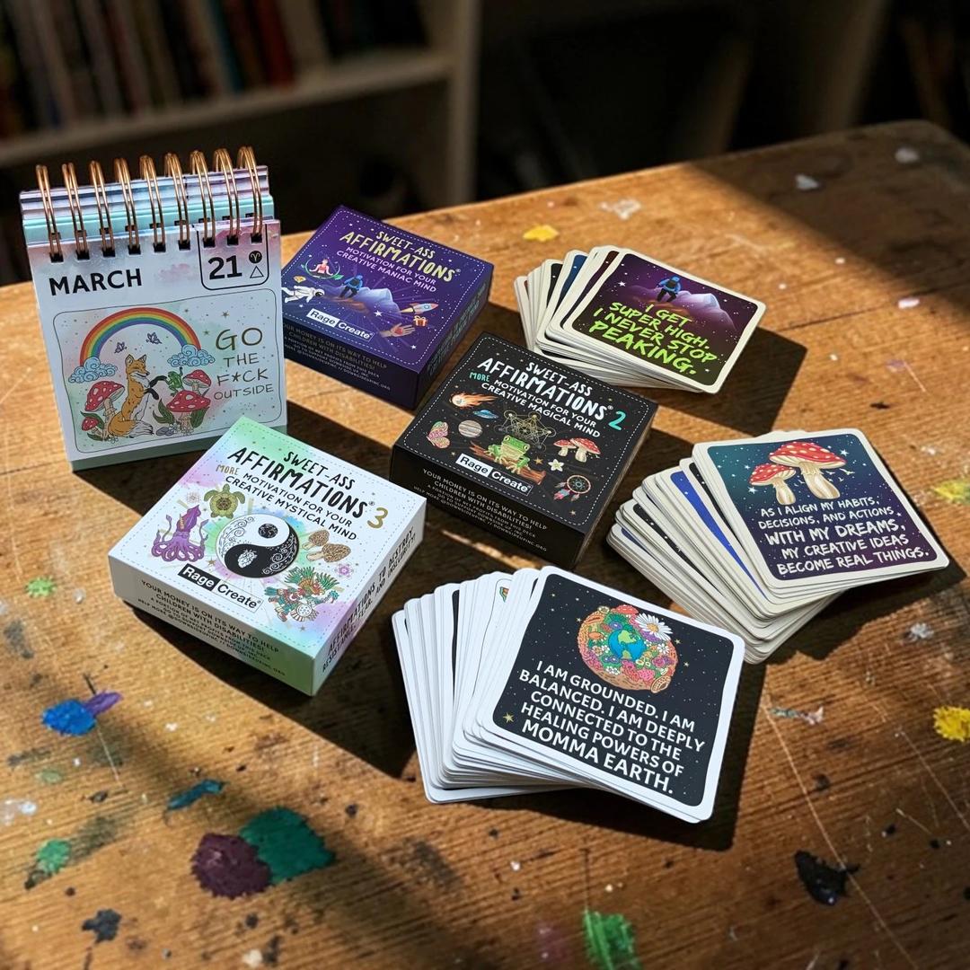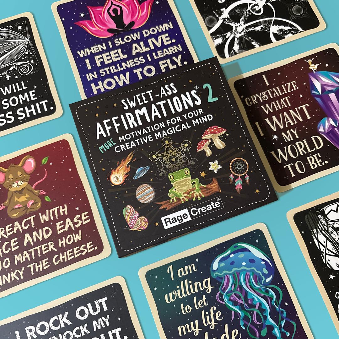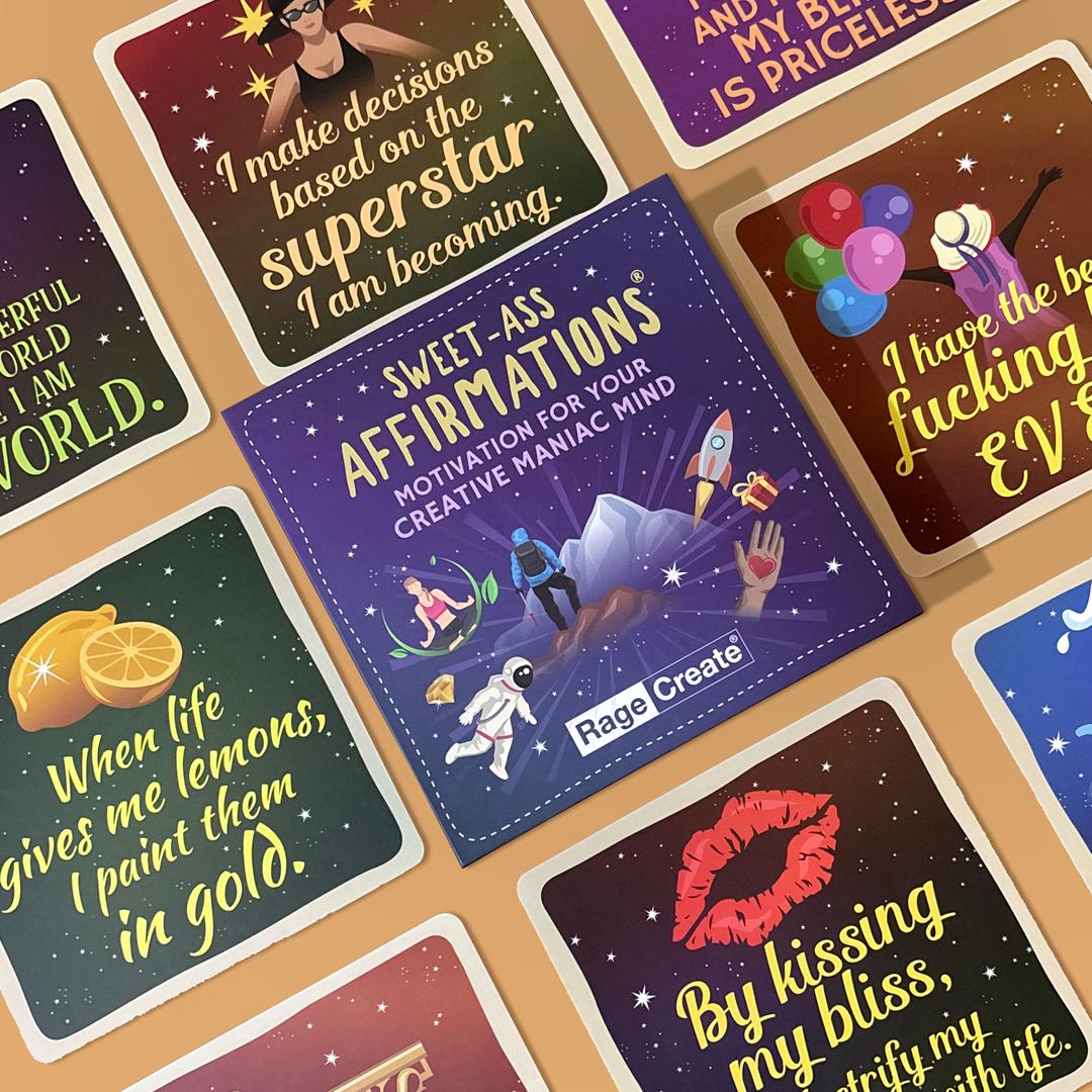Each deck in the Sweet-Ass Affirmations series tackles a different facet of the creative mind — whether you're chasing big ideas, navigating the messy middle, or just need something real to land on your desk at 7am.