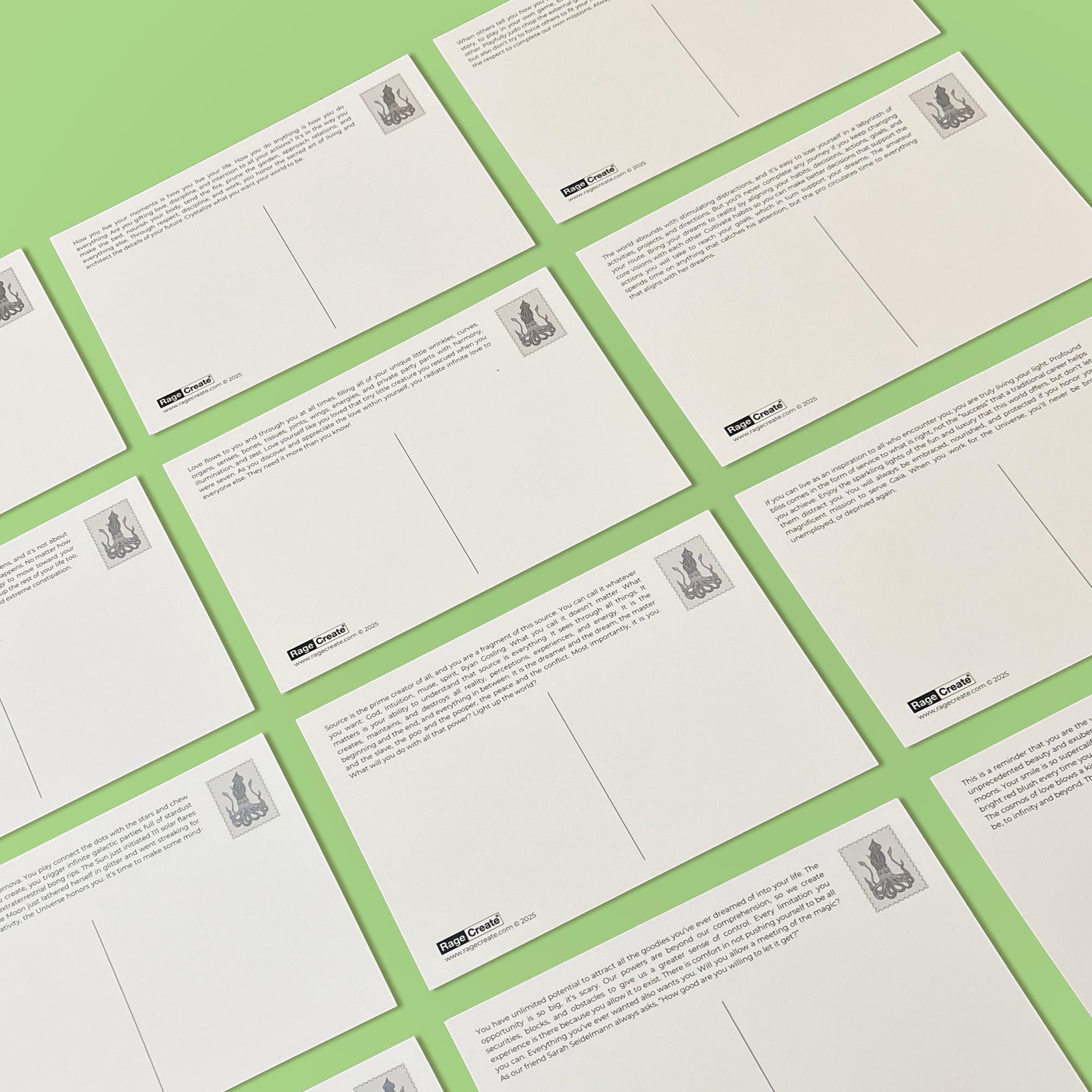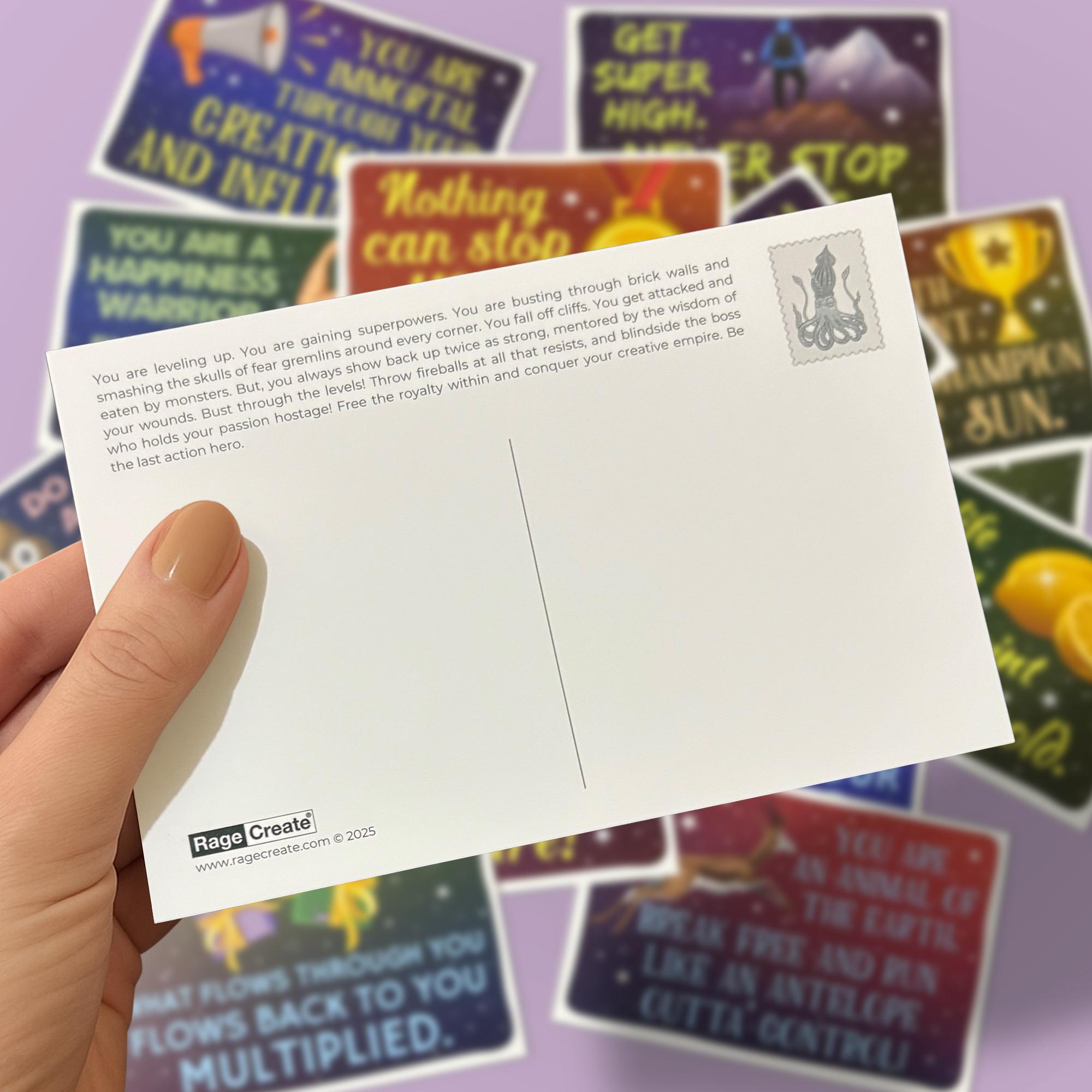 AI is cool, but these card were all hand written and illustrated by our wacky Rage Create team. Hands-on creativity is our life blood.